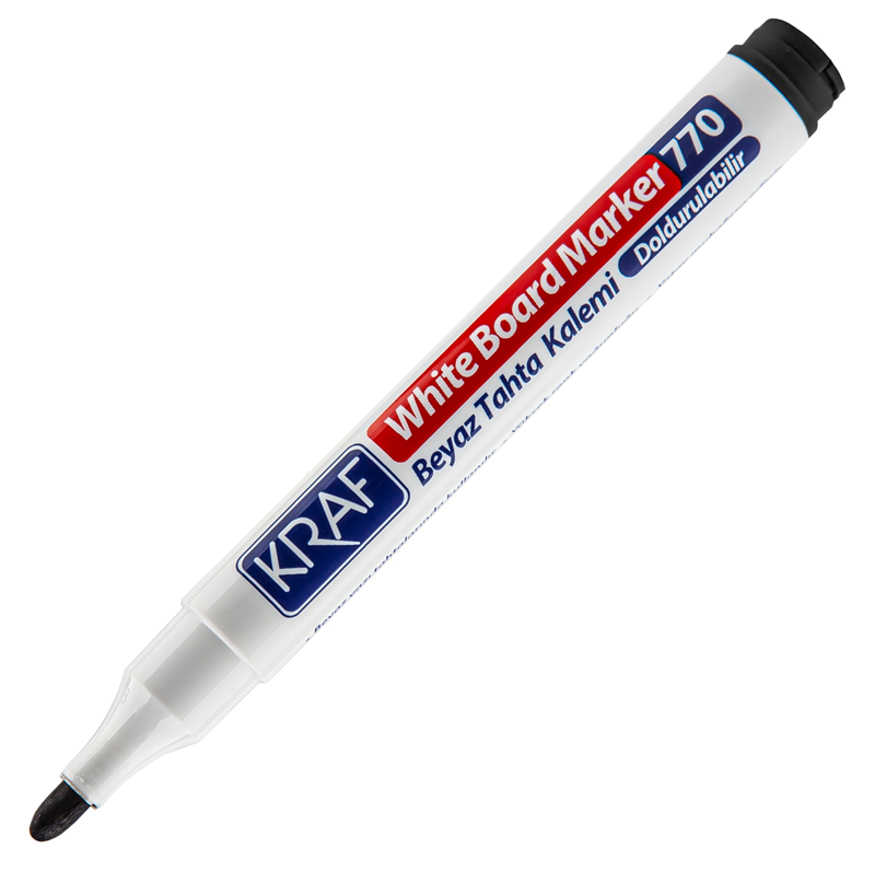 Kraf Beyaz Tahta Kalemi Doldurulabilir 770 Siyah, eğitim kurumlarından ofislere kadar her alanda pratik ve etkili bir yazım deneyimi sunar. Kullanıcı dostu tasarımı ve kaliteli mürekkebi ile beyaz tahta üzerinde net ve kalıcı yazılar oluşturmanızı sağlar.