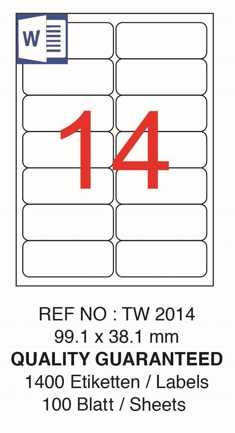 TANEX LASER ETİKET TW-2014, organizasyon ve etiketleme ihtiyaçlarınızı en üst düzeye çıkarmak için tasarlandı. 99.1 x 38.1 mm boyutlarıyla bu lazer etiketler, her türlü ofis ve ev uygulaması için mükemmel bir çözümdür. Tanex kalitesiyle üretilen bu etiketler, profesyonel görünüm ve dayanıklılık sunar.